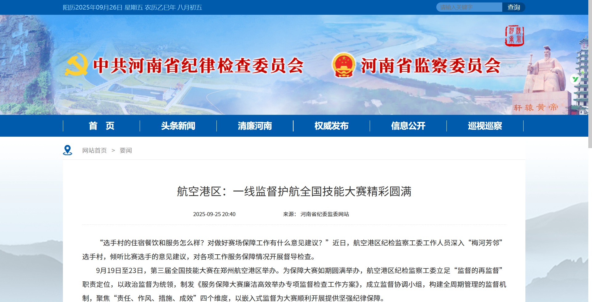 9月19日至23日,第三届全国技能大赛在郑州航空港区举办。为保障大赛如期圆满举办,航空港区纪检监察工委立足“监督的再监督”职责定位,以政治监督为统领,制发《服务保障大赛廉洁高效举办专项监督检查工作方案》,成立监督协调小组,构建全周期管理的监督机制,聚焦“责任、作风、措施、成效”四个维度,以嵌入式监督为大赛顺利开展提供坚强纪律保障。