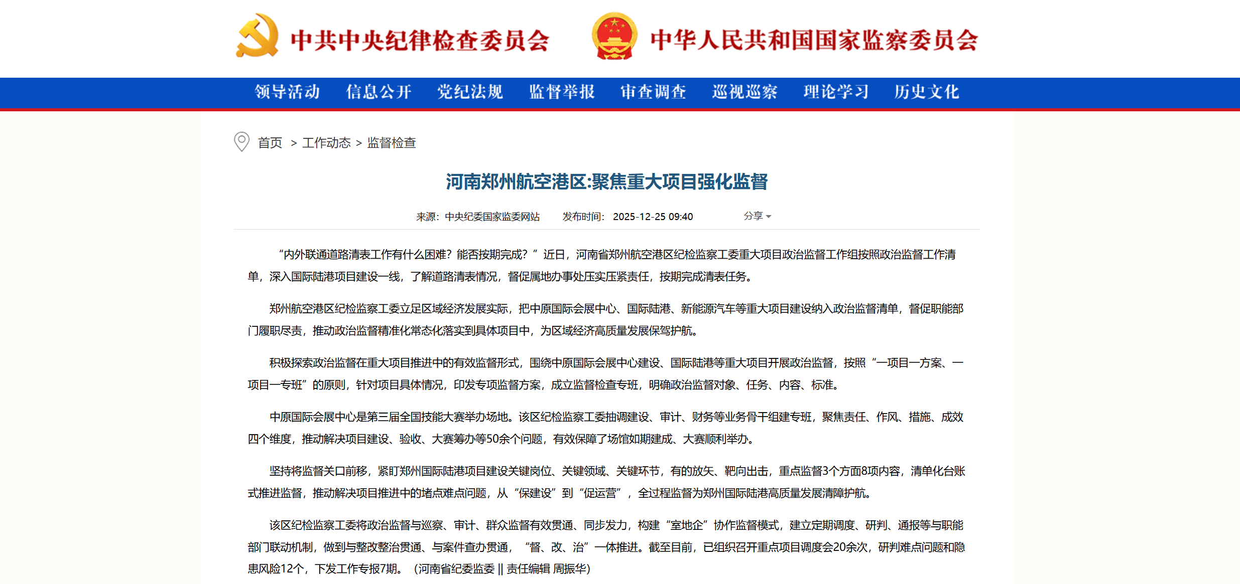 郑州航空港区纪检监察工委立足区域经济发展实际,把中原国际会展中心、国际陆港、新能源汽车等重大项目建设纳入政治监督清单,督促职能部门履职尽责,推动政治监督精准化常态化落实到具体项目中,为区域经济高质量发展保驾护航。